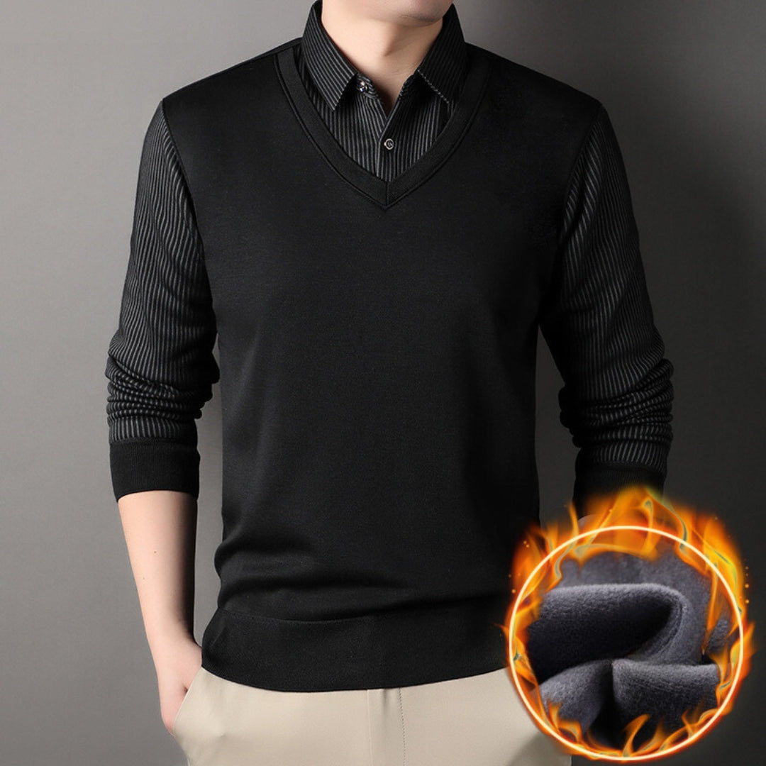Denne strikkede trøje med fleecefor har en stilfuld stribet skjortekrave og lange ærmer, der giver varme og komfort. Den kombinerer udseendet af et todelt jakkesæt med en falsk krave og fløjlsfor, og den er perfekt til forår og efterår og giver både stil og hygge.